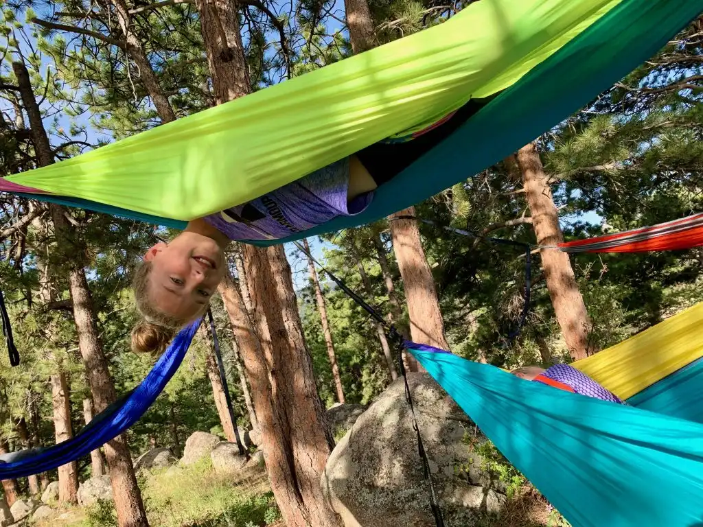 Note: we are in the process of transitioning all of our hammock straps to “tree saver” straps that are wider to prevent damage to the bark of trees. Also, make sure you check with the campground or park regarding its hammock rules. Some parks will only allow a specific number of hammock straps per tree or only allow hammocks over areas not covered by vegetation.