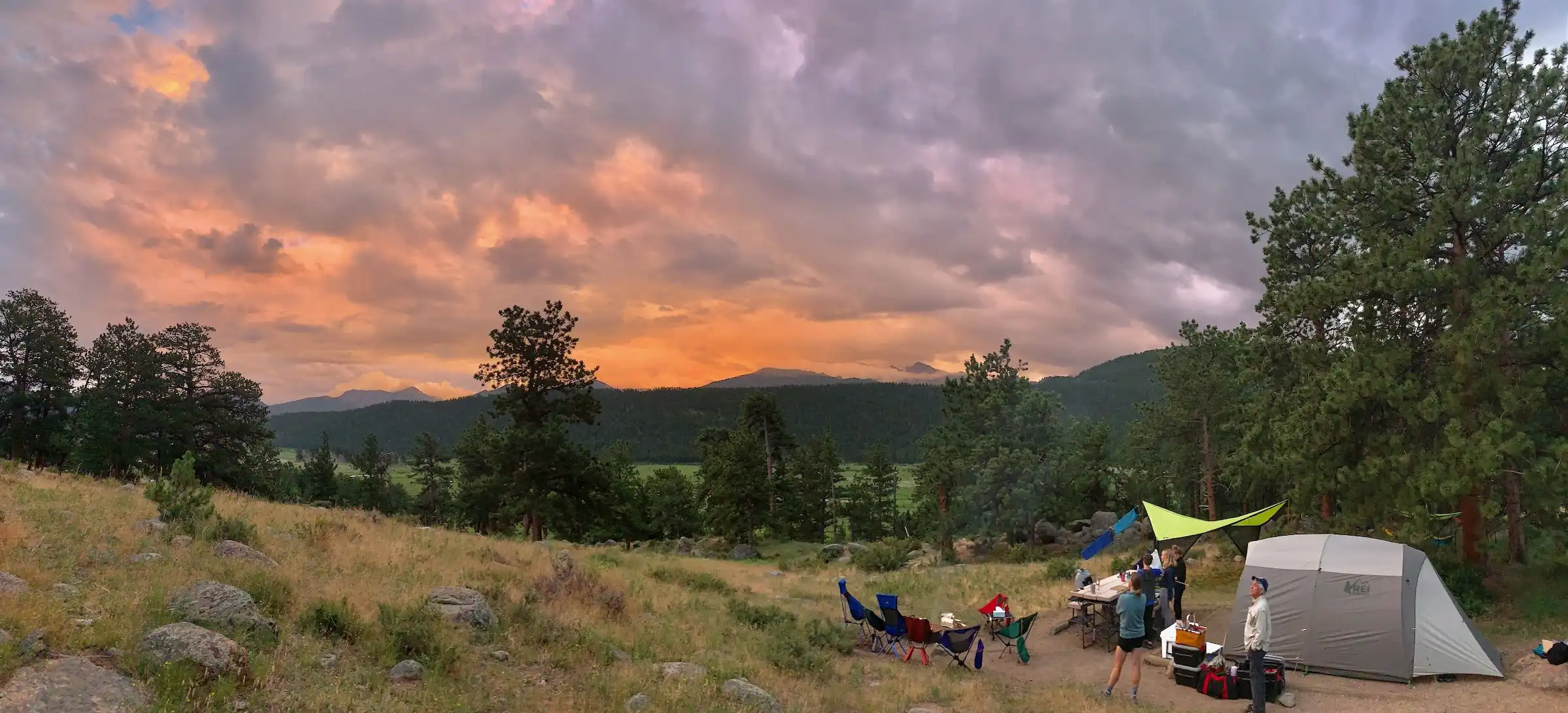 Moraine Park Campground, at 8,160 feet, is the largest campground in Rocky Mountain National Park but it doesn’t feel that way. It conceals its size by situating itself over many rolling hills on the northern slope of Moraine Park, which isolates sections of the campground from one another. It offers incredible views of Moraine Park below it and the mountain peaks surrounding it, including Long’s Peak, the tallest mountain in the park at 14, 258 feet.